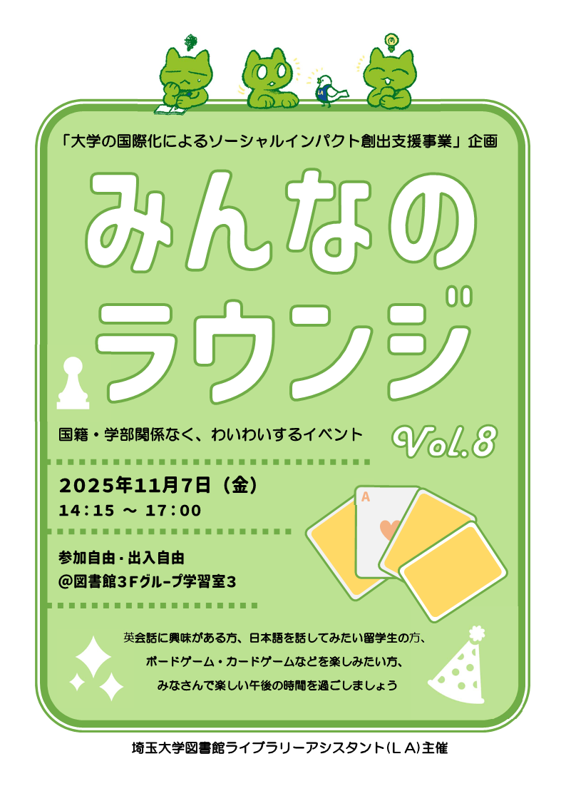 みんなのラウンジは、埼玉大学図書館ライブラリー・アシスタント(LA)が主催し、これからも定期的に開催していく予定です。