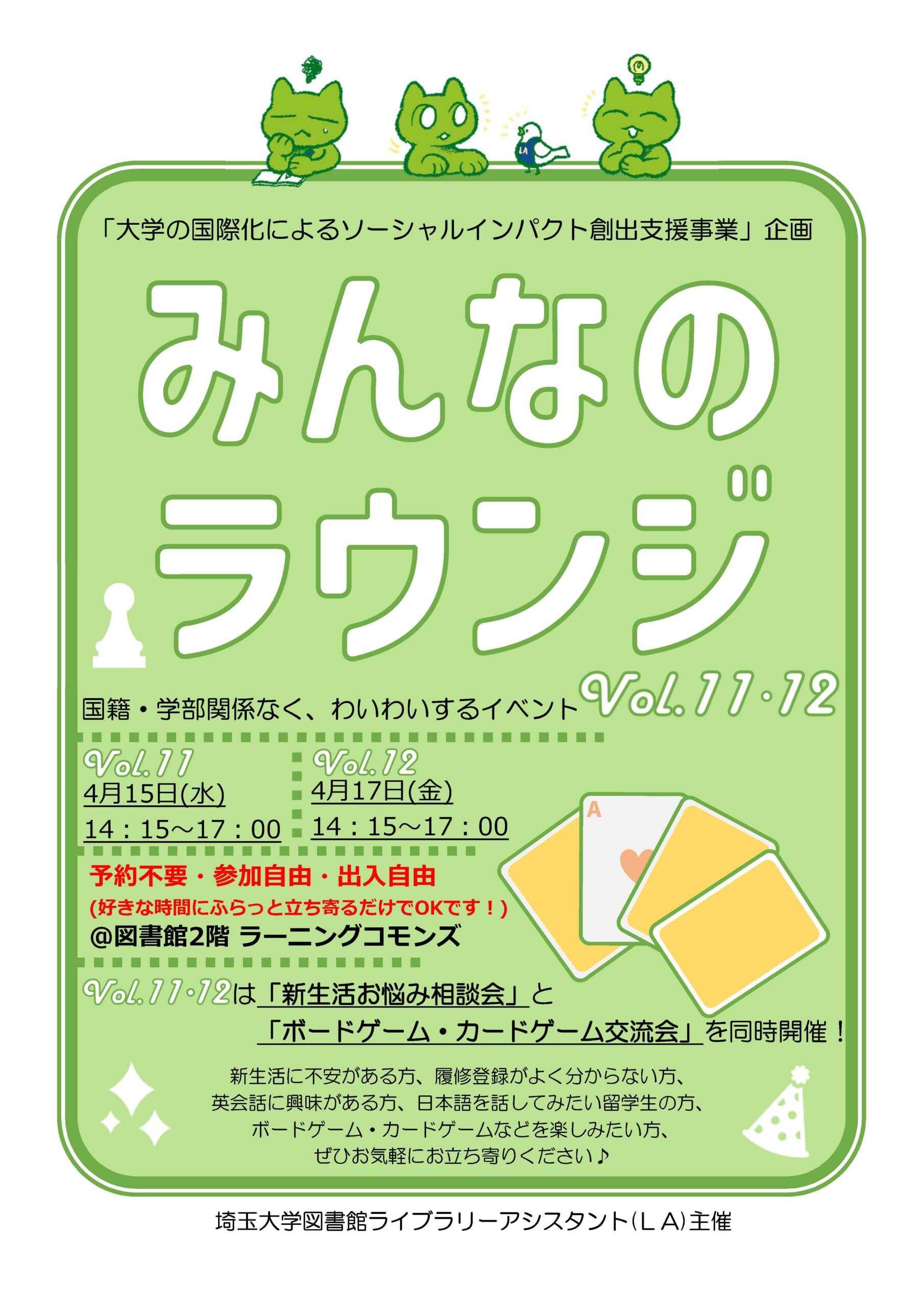 みんなのラウンジは、埼玉大学図書館ライブラリー・アシスタント(LA)が主催し、これからも定期的に開催していく予定です。