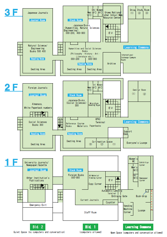 The 1st floor houses publications from universities and various institutions. The 2nd floor houses foreign journals, almanacs and yearly government statistics. The 3rd floor holds Japanese journals, catalogs and indexes.